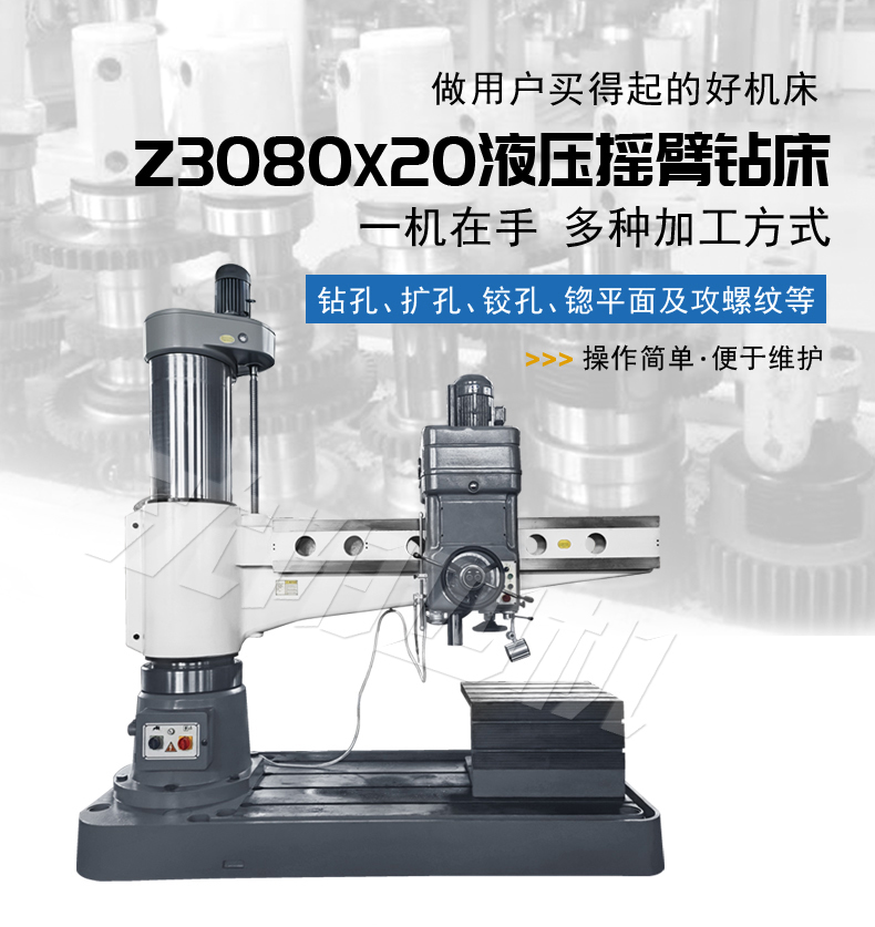 摇臂钻床主要是用钻头在工件上加工孔的机床。通常钻头旋转为主运动,钻头轴向移动为进给运动。钻床结构简单,加工精度相对较低,可钻通孔、盲孔,更换特殊刀具,可扩、锪孔,铰孔或进行攻丝等加工。
